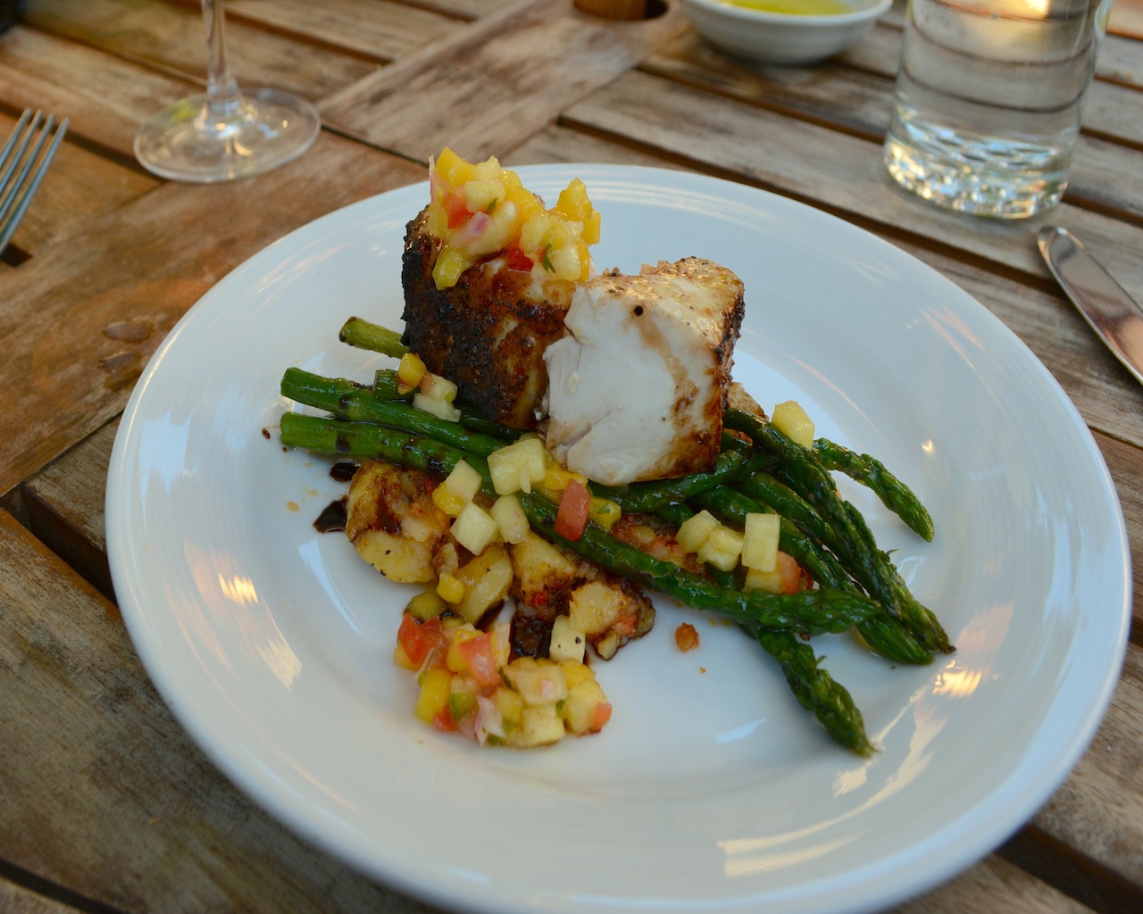 For our entrée, we went with two dishes. We had the Local Montauk Stripe Bass seared with local fresh baby potatoes & asparagus, drizzled with a sherry reduction & topped with a pineapple Mango salsa. The blending of the entire taste palate hit our taste buds all at once. I usually do not like sweet with salty, but this was delectable. I will say that this is a meal that you really must have all elements in each bite to fully appreciate this dish. If you select to eat each item separately you will miss the overall experience of the blending flavors and how they compliment each other. *I would like to note that the portion on this plate looks small because Dani and I shared the dish.