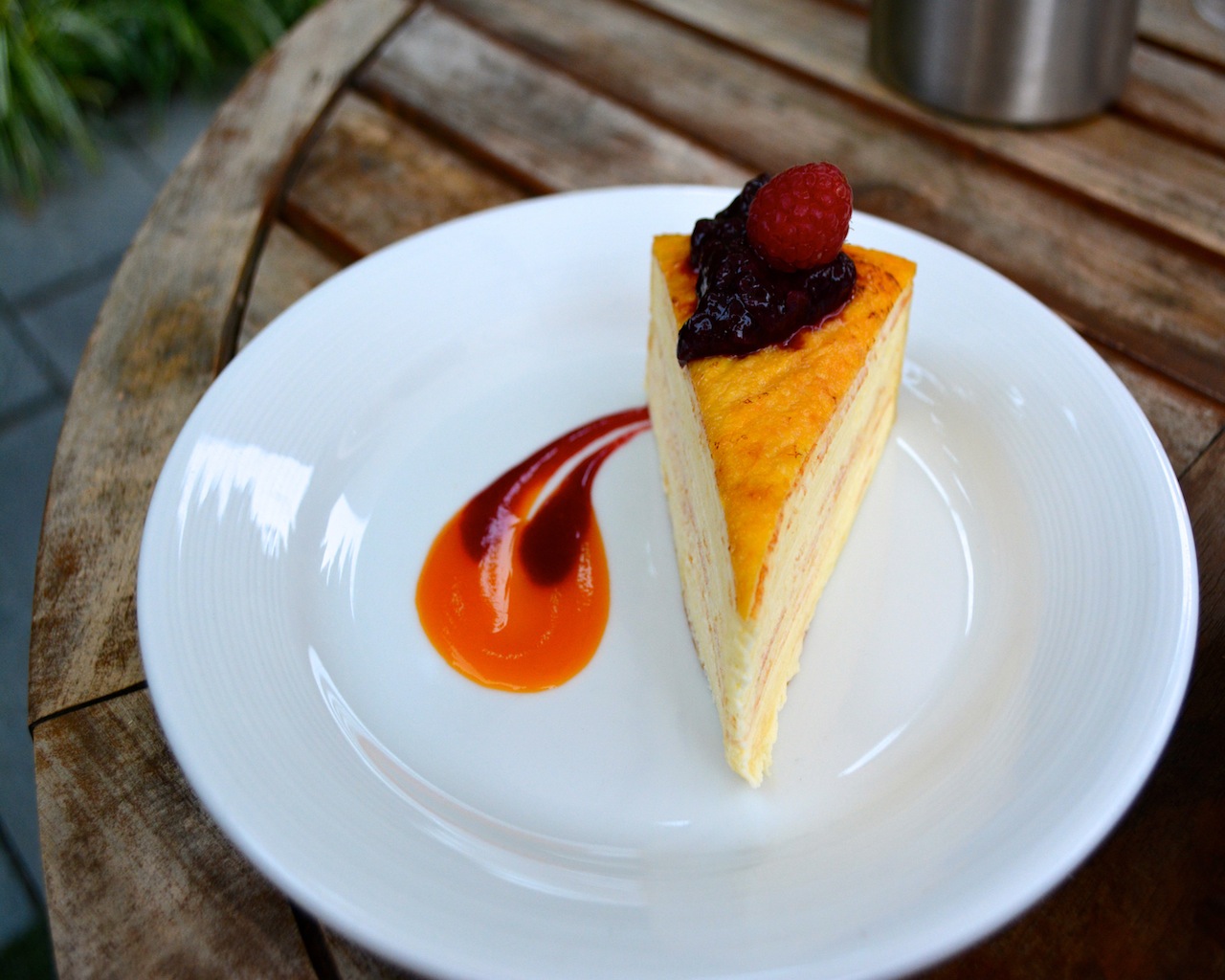 One would think after all that food we would need to be rolled to the car like Humpty Dumpty but how could we complete our dining experience without dessert. We were really full and could not finish the steak meal, so we asked for a doggy bag so we could make room for the 21 Layer Crepe Cake with Seasonal Compote. Dani did eat this by herself, if you are lactose intolerant like I am you may want to go with another choice.